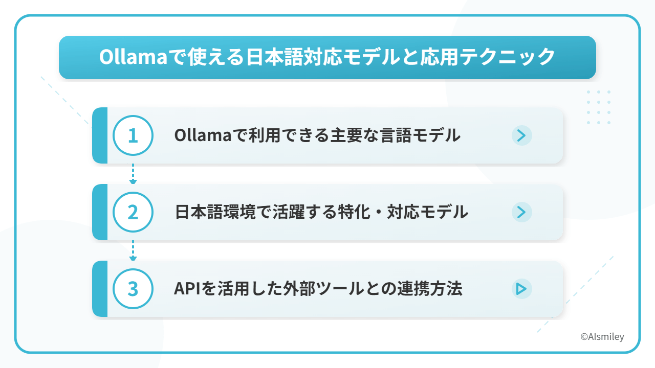 Ollamaの魅力の一つは、多様な言語モデルを手軽にローカル環境で実行できる点です。特に日本語ユーザーにとって嬉しいのは、日本語に対応した高性能モデルが増えていることでしょう。