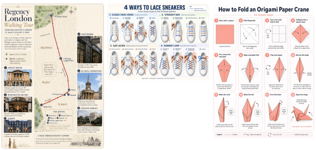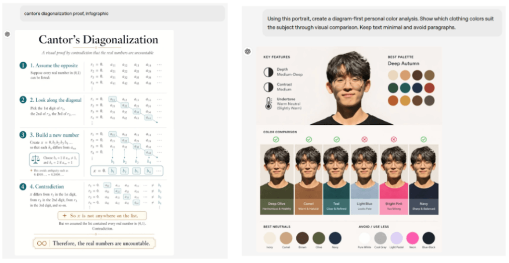 2025年12月までの最新知識を反映し、文脈に即した正確な画像を生成することもできます。情報の統合からレイアウト設計まで一貫して行えるため、正確性と分かりやすさが重視される解説資料や教育用の図においても、適切な余白や自然な視線誘導を取り入れた見やすいデザインを実現できます。