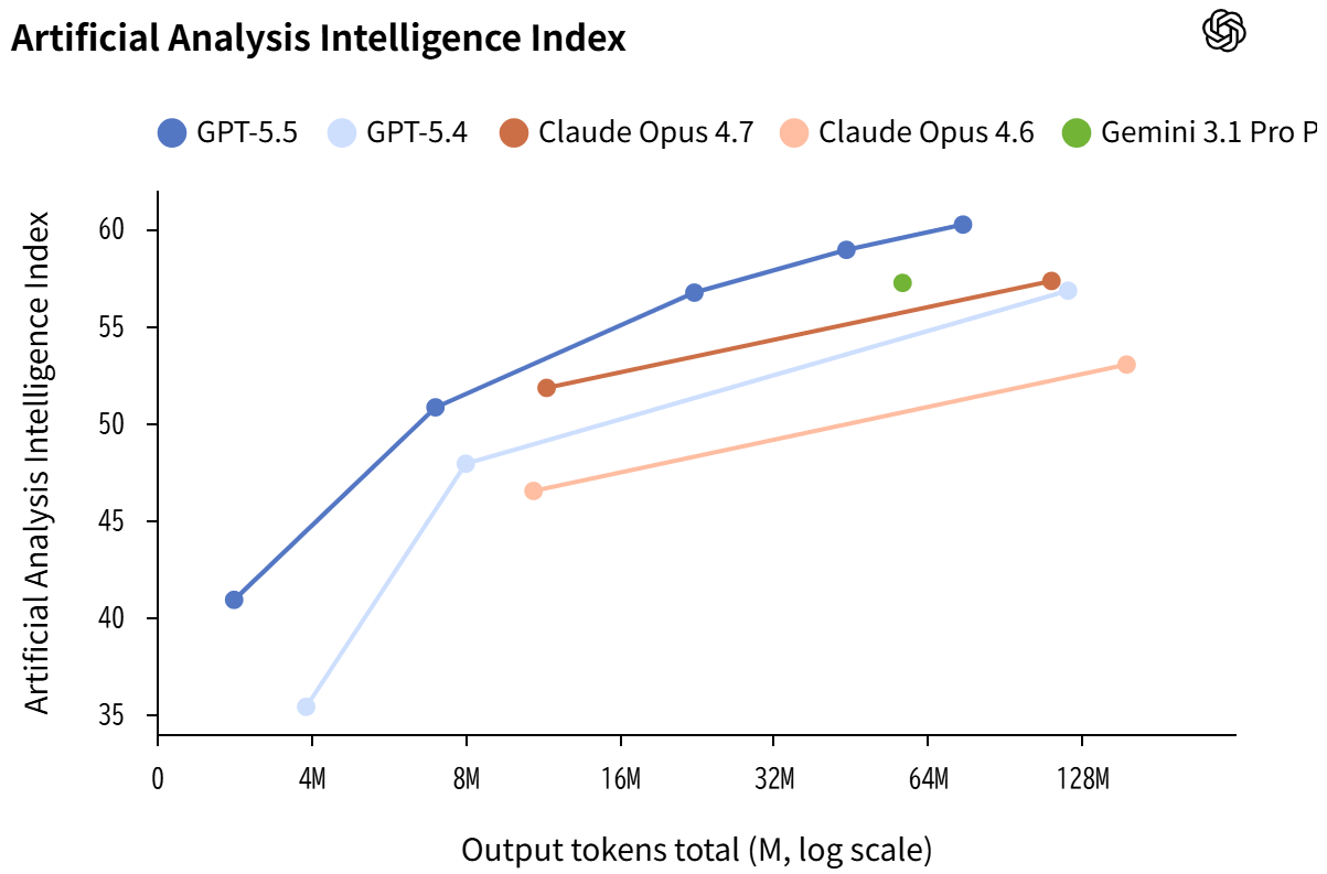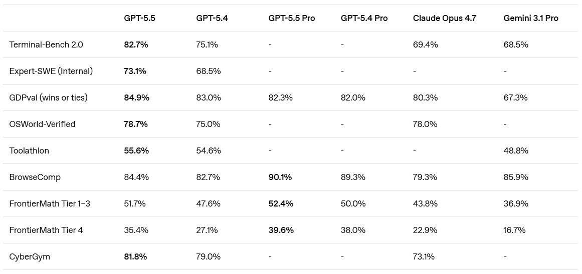 さらに、本モデルはエージェントコーディング、コンピュータ利用、知識労働、科学研究などの分野において大幅に進歩しているのが特徴です。加えて、前モデル「GPT‑5.4」と同等の応答速度でありながら、高いレベルの能力を発揮し、ほぼすべての評価指数で性能が向上しています。
