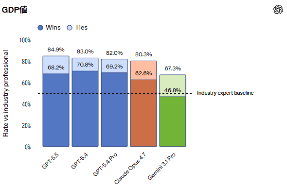 そのうえ、本モデルは、コンピュータ作業を反映した複数のベンチマークで最先端のパフォーマンスを達成しており、44の職種に関連するタスクの処理能力をテストする「GDPval」では84.9%の結果になりました。