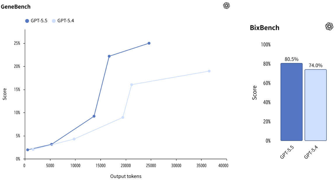 そのほか、科学研究関連のベンチマークでも前モデルを上回っており、遺伝学および定量的生物学における多段階科学データ分析に焦点を当てた「GeneBench」では優れた性能を示しています。同様に、実務に近いバイオインフォマティクスやデータ分析を想定した「BixBench」においてもスコアが公表されているモデルの中で最高のパフォーマンスを達成しました。
