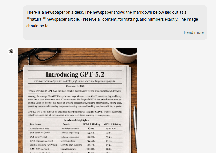 さらに、「GPT Image 1.5」は指示への追従性が向上しており、要素間の関係性を意図通りに保ったまま、より正確な編集や複雑なオリジナル構成が行えます。テキストレンダリング性能も改善され、小さく高密度な文字の描画が可能です。