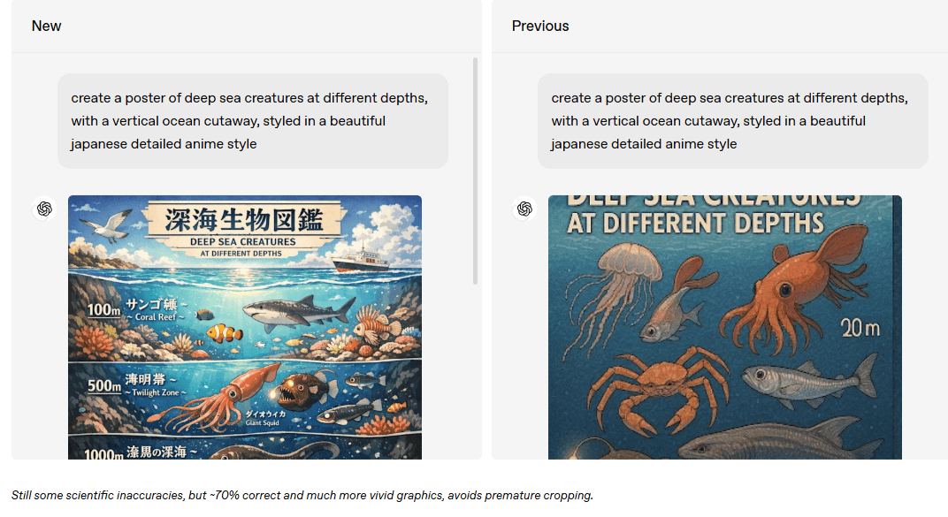 OpenAIは、パフォーマンス評価のために、従来の画像生成モデルより多くのケースを再実行しました。その結果、多くの場面で明確な改善が確認された一方で、出力は依然として完全ではなく、今後のイテレーションでさらなる改善の余地があるとも説明しています。