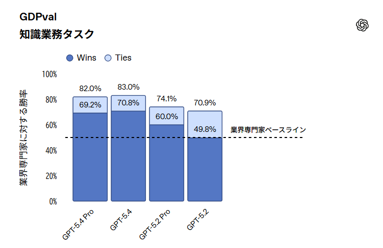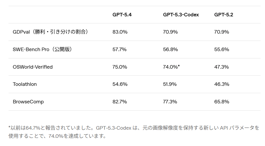 知識業務では、「GPT-5.2」の汎用推論能力を基盤にしながら、専門職の実務に近いタスクでより一貫性のある成果を生み出します。44職種の知識業務を評価するベンチマーク「GDPval」では、「GPT-5.4」は83.0%を記録し、「GPT-5.2」の71.0%を上回りました。