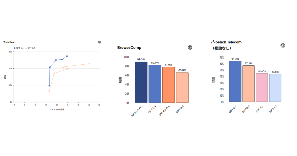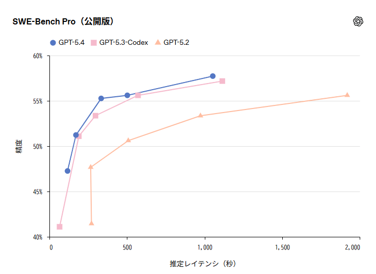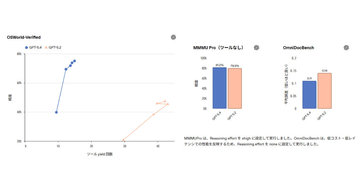 「GPT-5.4」は、これまでで最も効率的なリーズニングモデルでもあります。「GPT-5.2」と比較して問題解決に必要なトークン数を大幅に削減し、処理速度の向上とコスト削減を実現しました。
