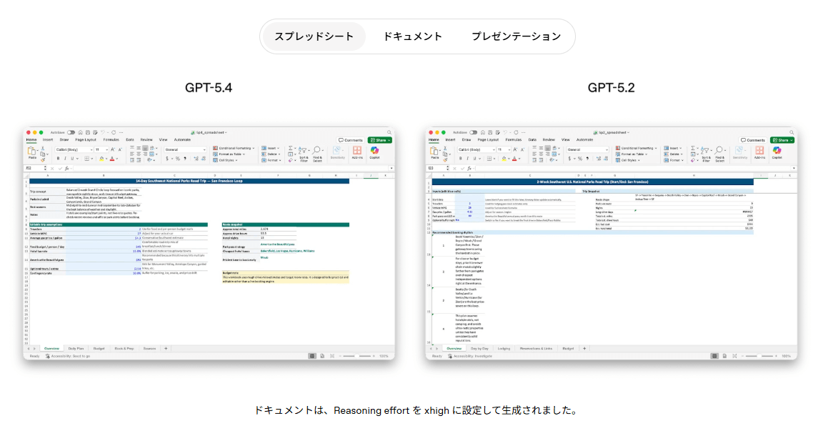 「GPT‑5.4」では、スプレッドシート、プレゼンテーション、ドキュメントの作成・編集能力も強化されています。投資銀行アナリストの業務を想定した社内ベンチマークでは、「GPT-5.4」は平均87.5%を記録し、「GPT-5.2」の68.4%を大きく上回りました。