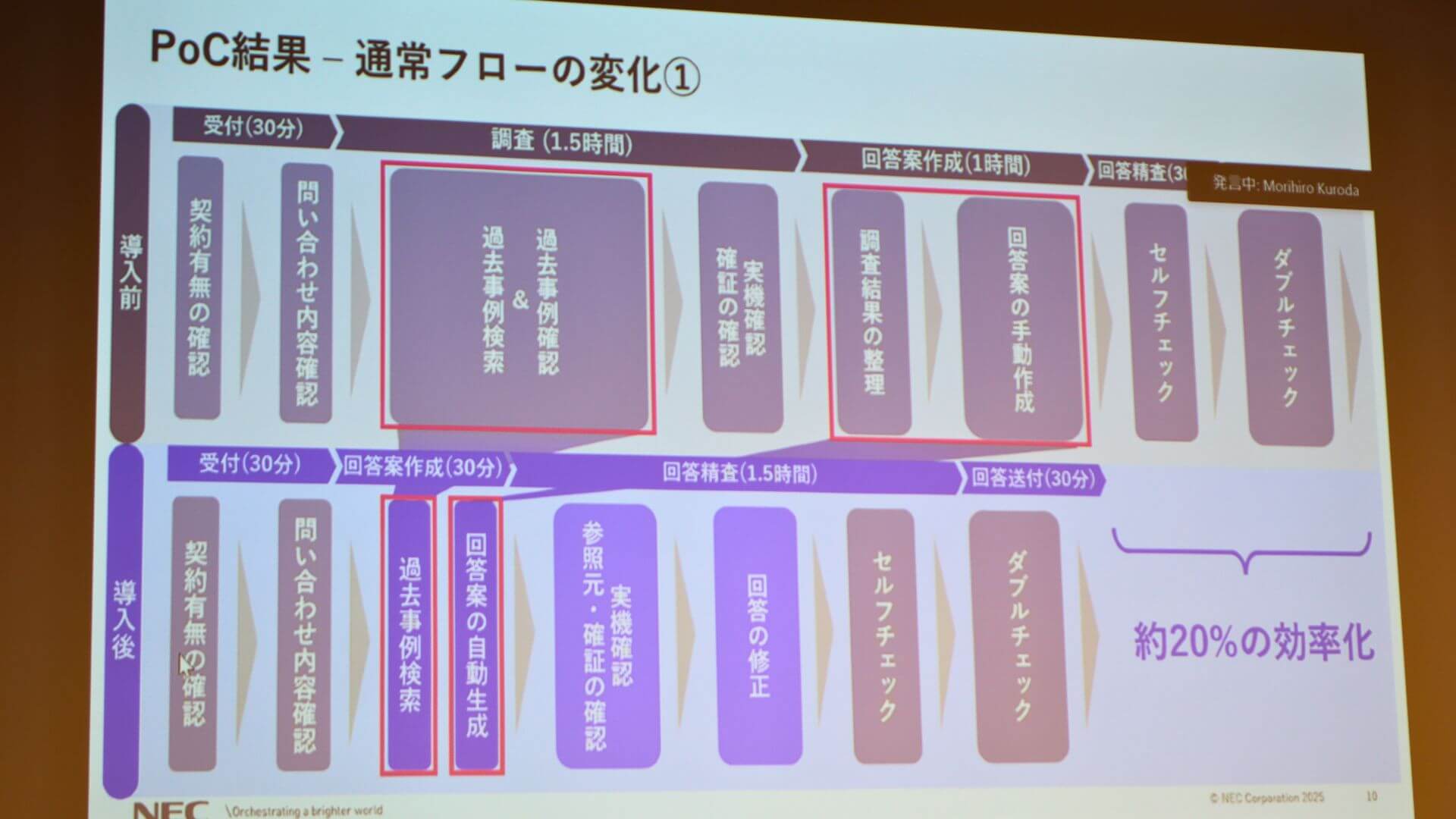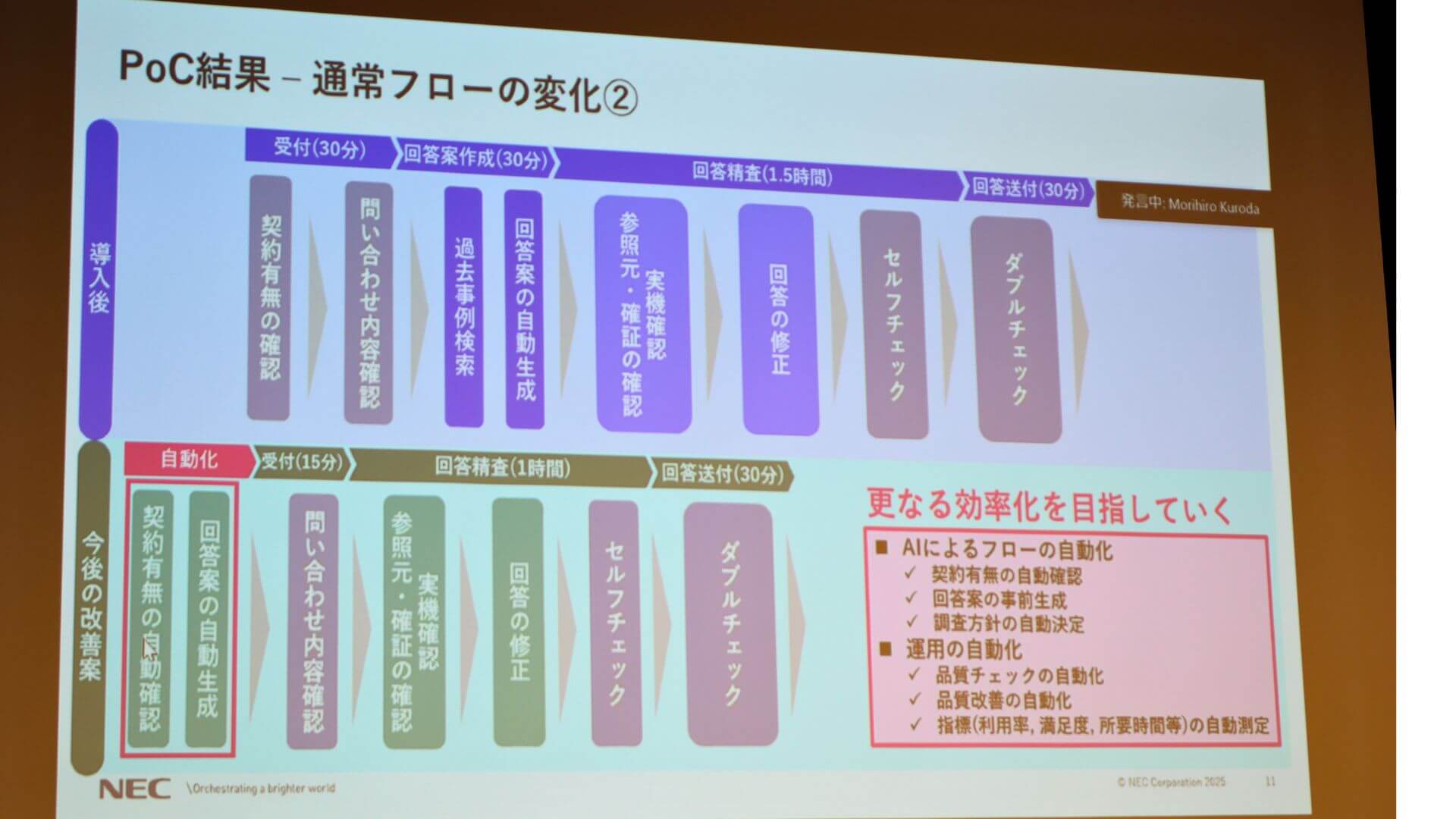 このシステムを用いたPoCの結果、最終的に人が内容をチェック・修正する工程を含めたとしても、全体で約20%の工数削減が見込めるといいます。現在は実用化に向けた最終調整が進んでおり、12月上旬にはNEC社内で本番運用が開始される予定です。