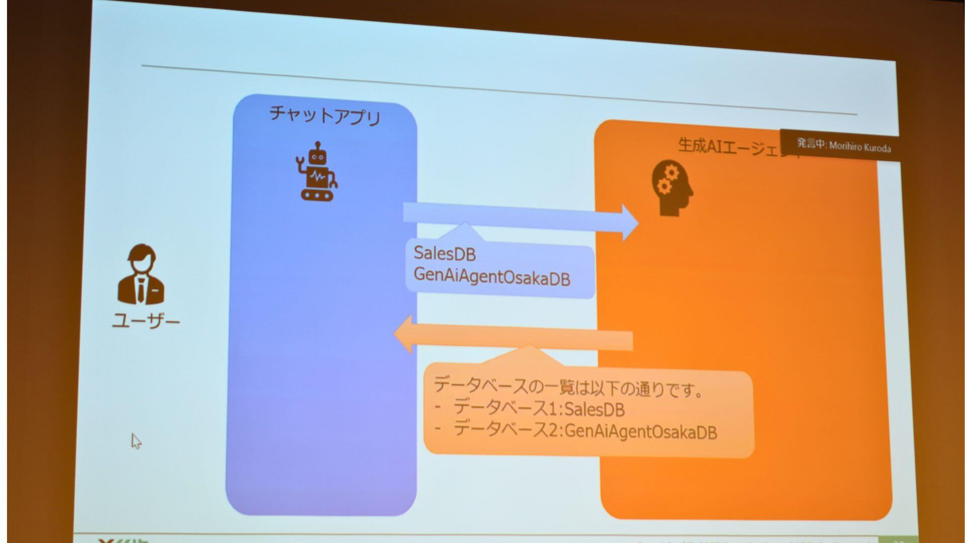 チャットで「私の10月の残業時間は何時間ですか?」と尋ねると、AIはその裏側で、ユーザーには見えない「あなたは優秀なAIエージェントです」といった役割定義のプロンプトと共に、社員番号や対象期間などの個人情報をパラメータとして抽出して関数を呼び出し、システムから得た数値を元に自然な日本語で回答する様子が実演されました。
