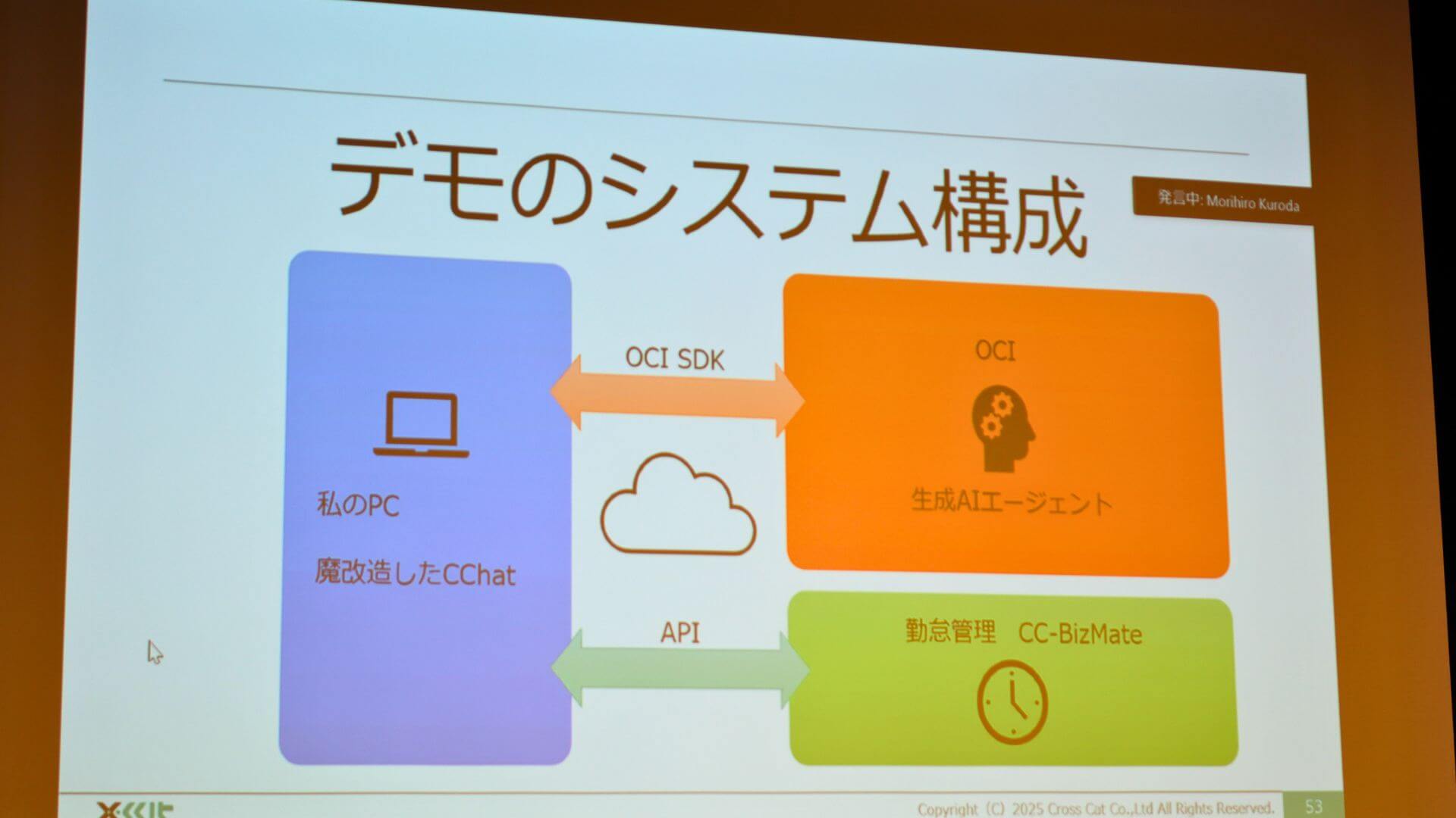 デモでは、同社が提供するLLMとRAGを使用したSaaS型AIチャットサービス「CChat」を今回のために改造し、OCI SDKおよびAPIを通じて勤怠管理システム「CC-BizMate」と連携させたシステムが披露されました。