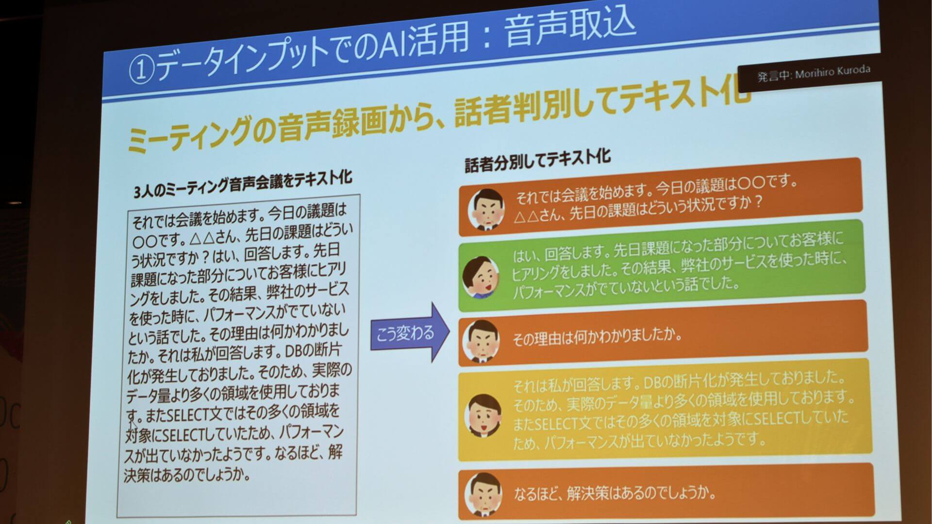 音声に関してはOCI Speechを活用しています。OCI Speechの特徴として話者判別ができることが挙げられます。似たようなことが出来るサービスは数多くありますが、それは個別のID、マイクごとに誰が発言したかを判別しています。しかし、OCI Speechでは、一つの音声データ、同じマイクで話していたとしても話者を判別し、記録できる点が大きな強みです。