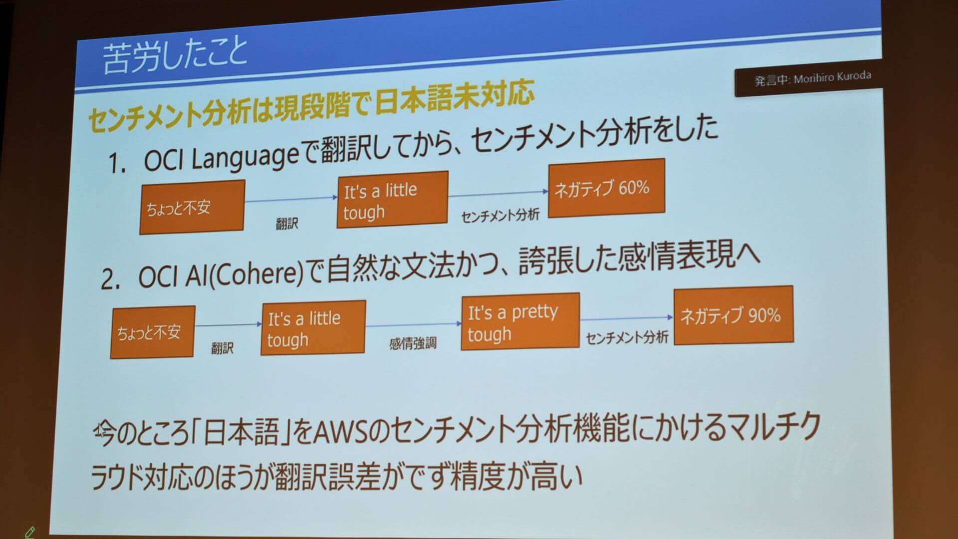 アプリケーションの実装においては、日本語データの分析精度を最大化するための工夫が凝らされています。OCI LanguageのAPIによる分析に加え、より精緻な結果を得るために、一度英語へ変換するアプローチを採用しました。その際、OCIと連携する生成AIサービスCohereを活用して、文脈や感情のニュアンスを強調した自然な表現に変換してから分析にかけることで、センチメント分析の品質を飛躍的に向上させることに成功しました。
