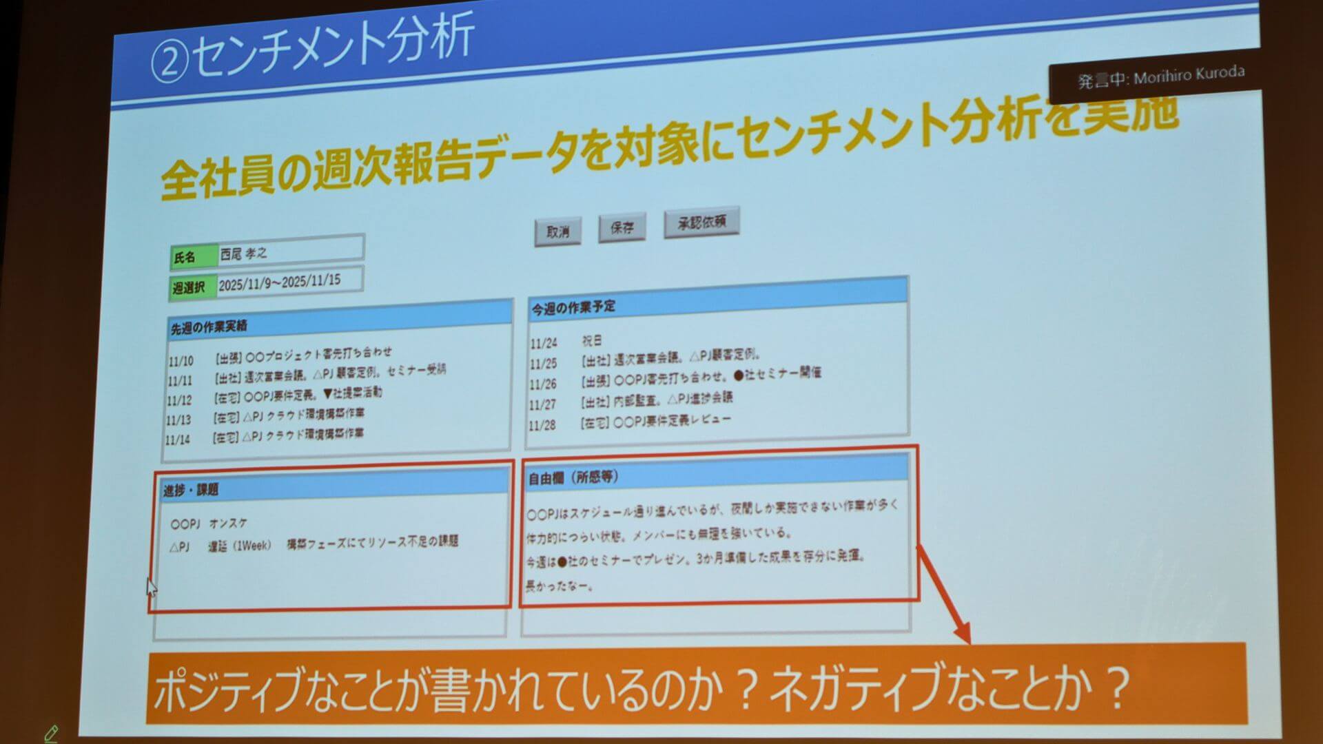 デモでは伊藤氏から、OCIの感情分析機能を活用してAPEXで作成した2つのアプリケーションによる週次報告の分析結果が披露されました。1つ目は「感情タイムラインビュー」です。時系列ごとに感情の波がグラフや折れ線で表示され、その社員がポジティブな発言が多いか、あるいはネガティブな発言が増えているかといった状態を視覚的に把握するのに役立ちます。