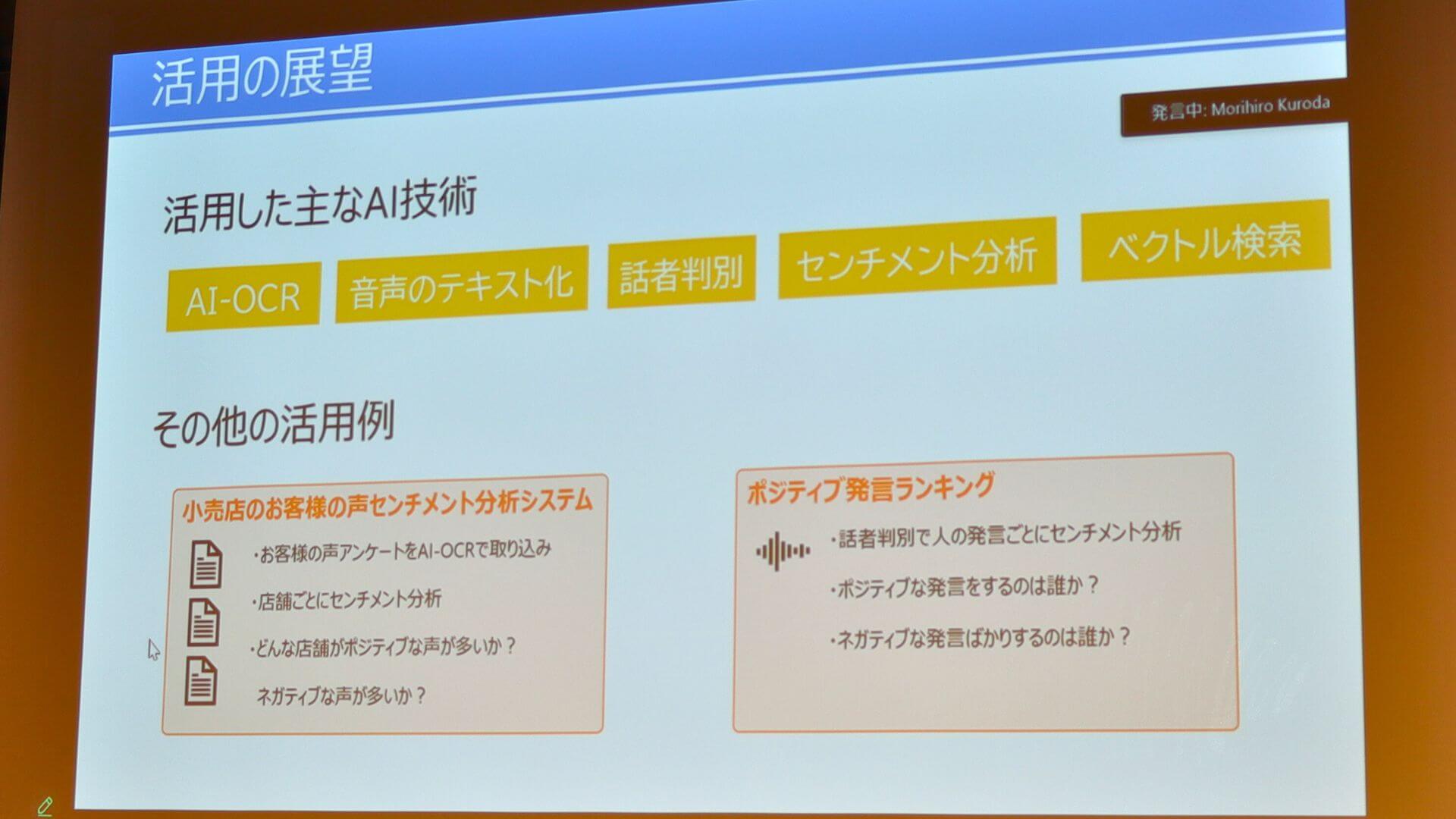 西尾氏はプレゼンの締めくくりとして、今回使用した技術を組み合わせ、小売店のお客様の声センチメント分析システムや、ポジティブランキングなど傾向の可視化に利用できるのではないかと、活用の可能性を示唆しました。