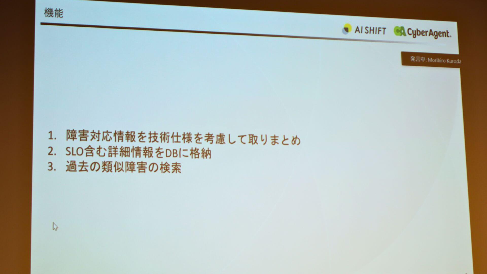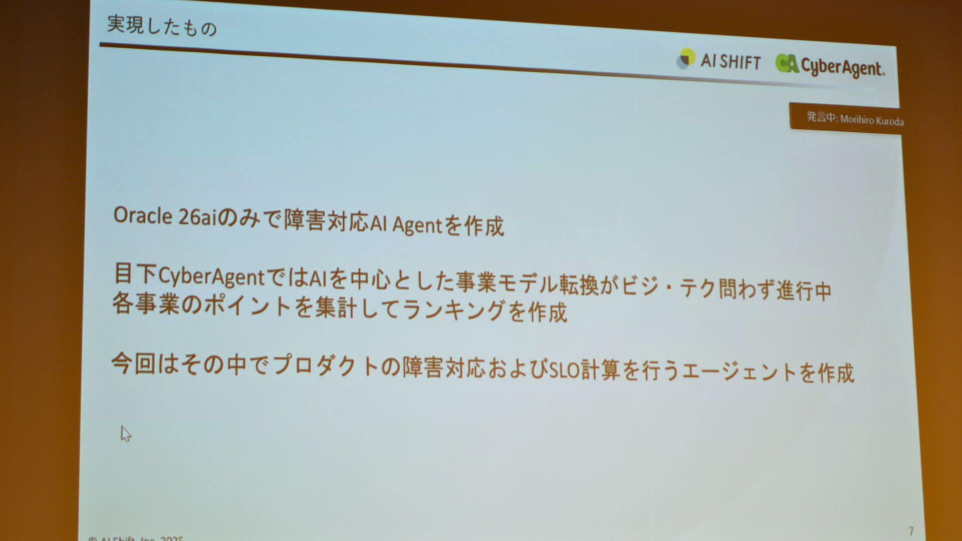 「Oracle AI選手権」の最後を締めくくったのは、株式会社AI Shiftです。「Autonomous AI Databaseだけで作る開発チームの障害対応負荷を軽減するAI Agent」というテーマで、株式会社AI Shift 執行役員 CTOの青野 健利氏が登壇しました。今回のテーマの背景として、親会社であるサイバーエージェントでは各事業でAIを中心とした事業モデルへの転換が進んでおり、その中でシステム障害が発生した際の対応に手間がかかっているという課題がありました。
