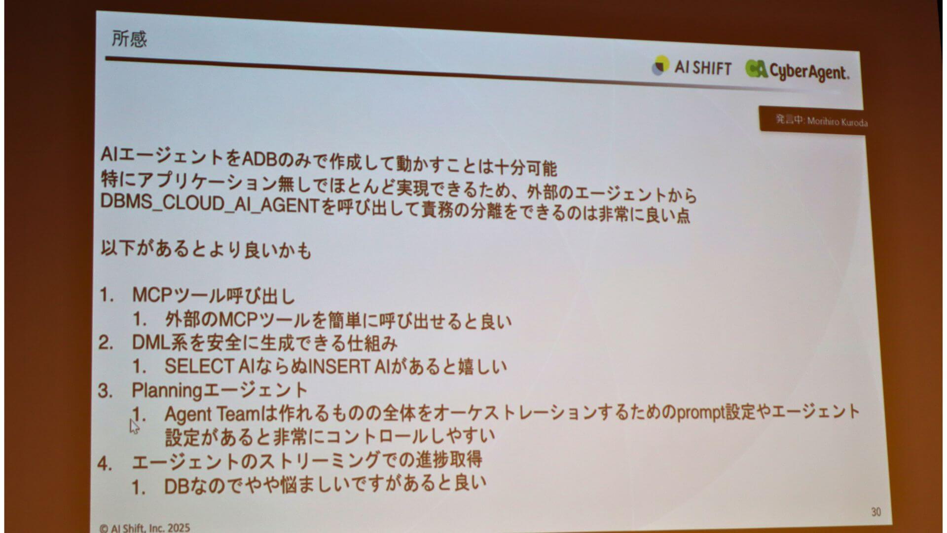 青野氏は、AIエージェントをADBのみで作成することは十分可能だったと手応えを口にします。外部アプリケーションサーバーを立てずとも高度な処理が実現でき、外部のエージェントからADBを呼び出す構成にすることで、データ処理の責務をデータベース側に分離できる点は非常に優れていると評価し、プレゼンテーションを締めくくりました。