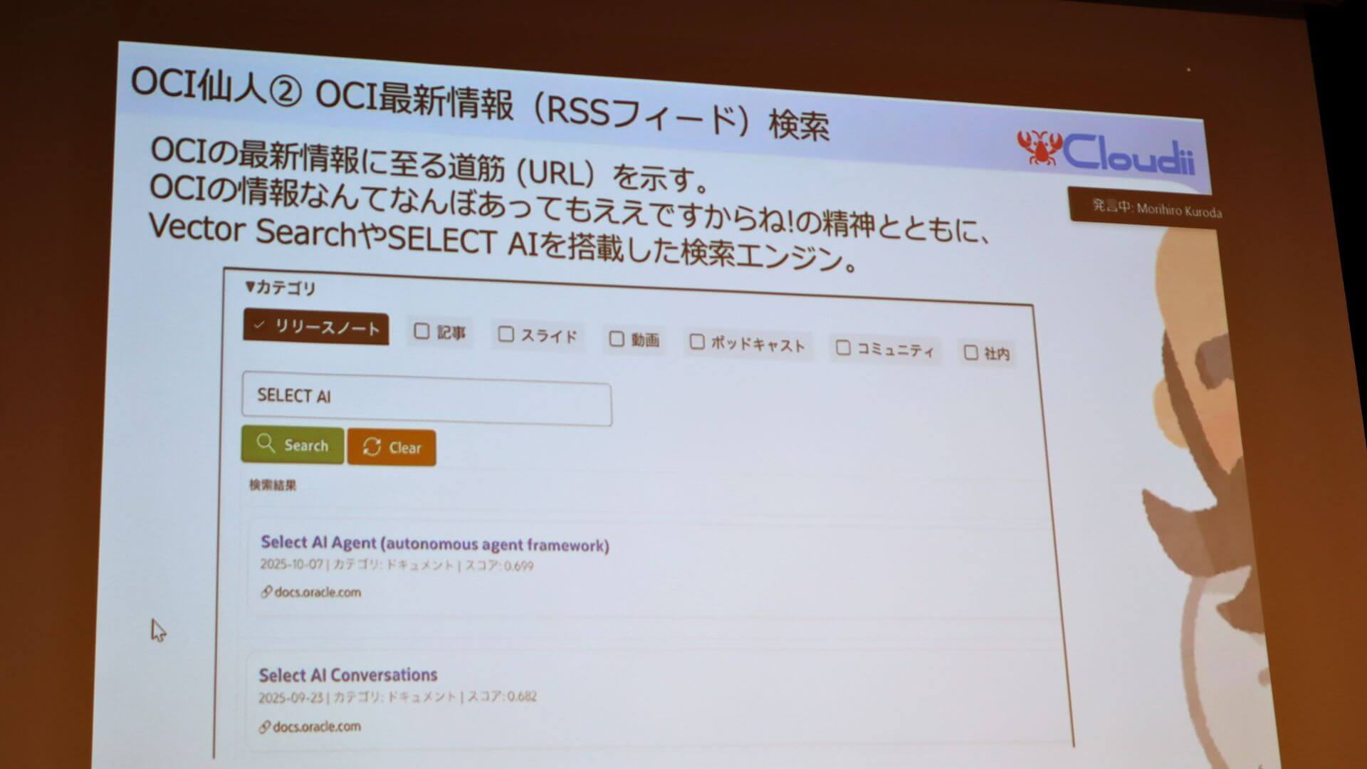そして二つ目が、今回のプレゼンテーションの主軸となった「OCI最新情報(RSSフィード)検索機能」です。これはAI Vector Search(ベクトル検索)やSelect AIを搭載し、ユーザーの問いかけに対して関連するOCIの最新記事URLを提示する検索エンジンです。