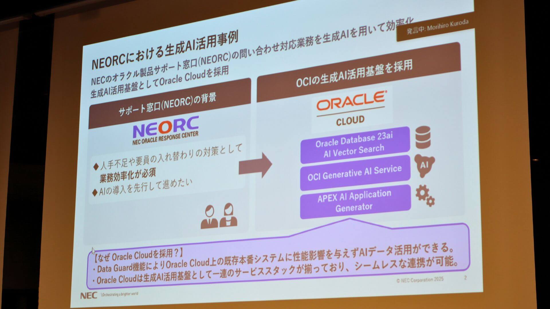続いて日本電気株式会社 プラットフォーム・テクノロジーサービス事業部門 データ基盤サービス統括部 岩本 裕司氏から、問い合わせ対応に対してオラクルの生成AIを活用した事例についてプレゼンが行われました。