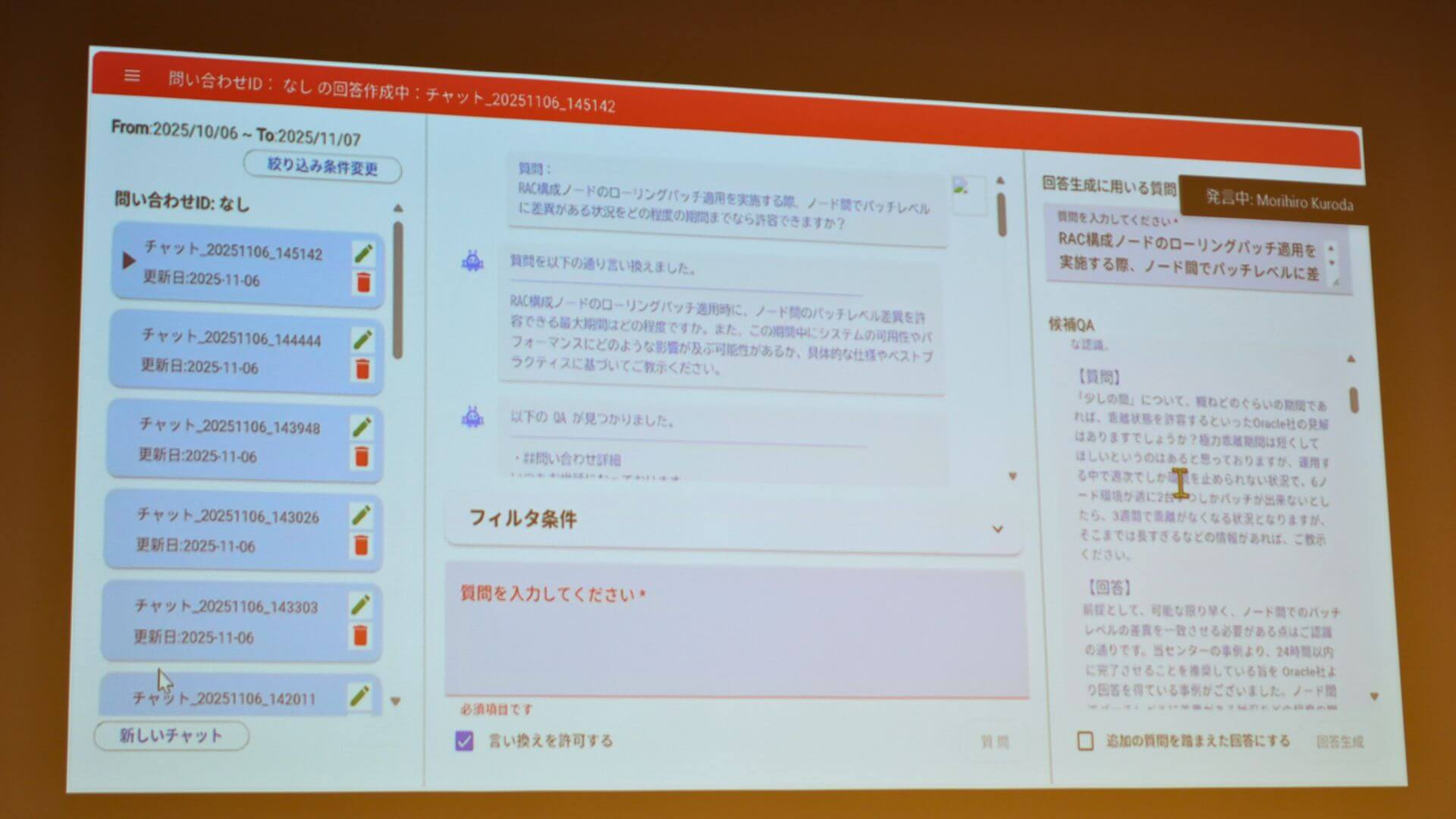 デモ映像では、入力された質問文をAIが検索しやすい表現に自動変換するオプション機能が紹介され、経験の浅い担当者でも精度の高い検索結果を得られる工夫が写し出されました。生成された回答案と併せて、根拠となる過去の類似事例や公式ドキュメントへのリンクも画面上に提示されるため、担当者は情報の正確性を即座に確認しながら効率的に回答を作成できます。