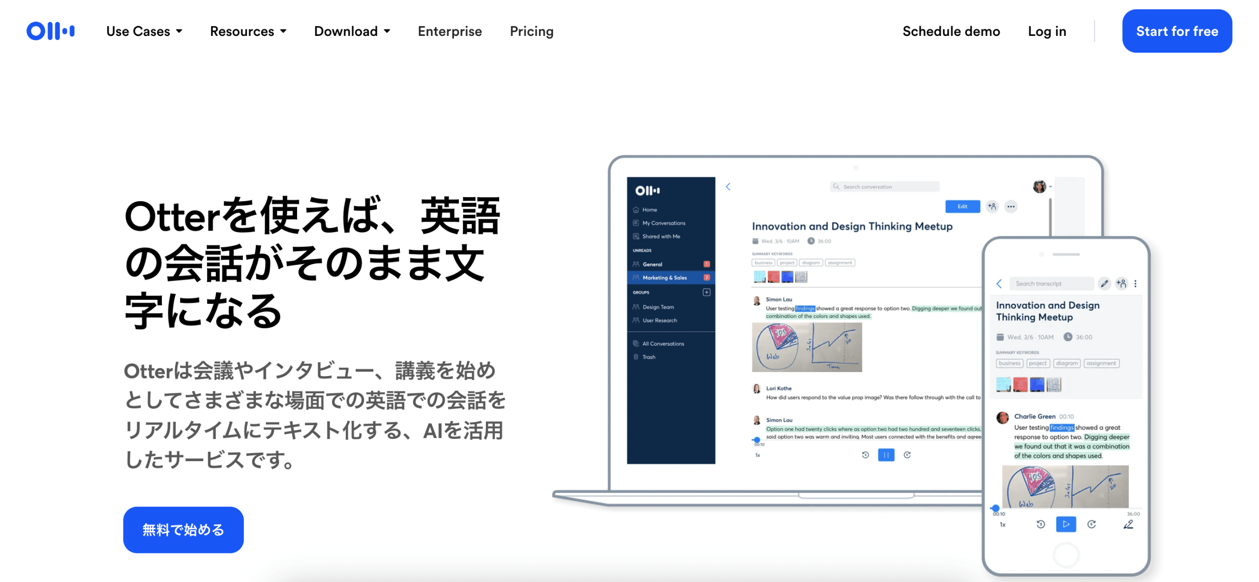 Otter.aiは英語の音声認識に特化したAIツールです。会議やインタビューの内容をリアルタイムでテキスト化できるため、会話中でも文字ベースで確認できます。
