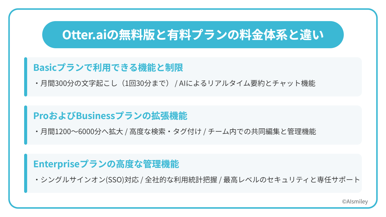 Otter.aiには無料のBasicプランから、企業向けのEnterpriseプランまで4つの料金体系があります。利用頻度や会議の長さ、参加人数によって必要な機能が異なるため、自社に合ったプランを選ぶことが重要です。
