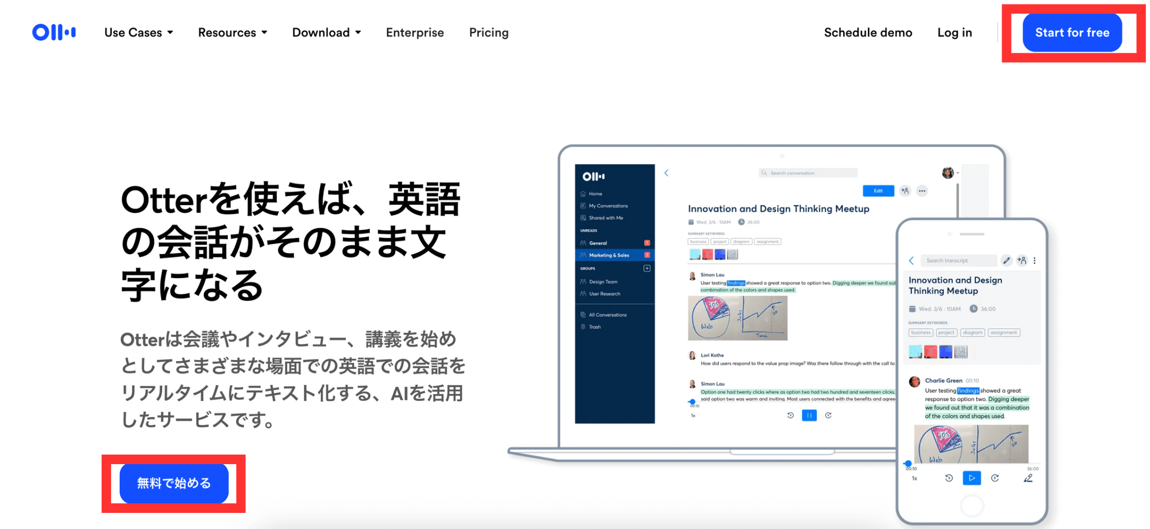 公式サイト(https://otter.ai/)にアクセスし、「Start for free」または「無料で始める」ボタンをクリックします。