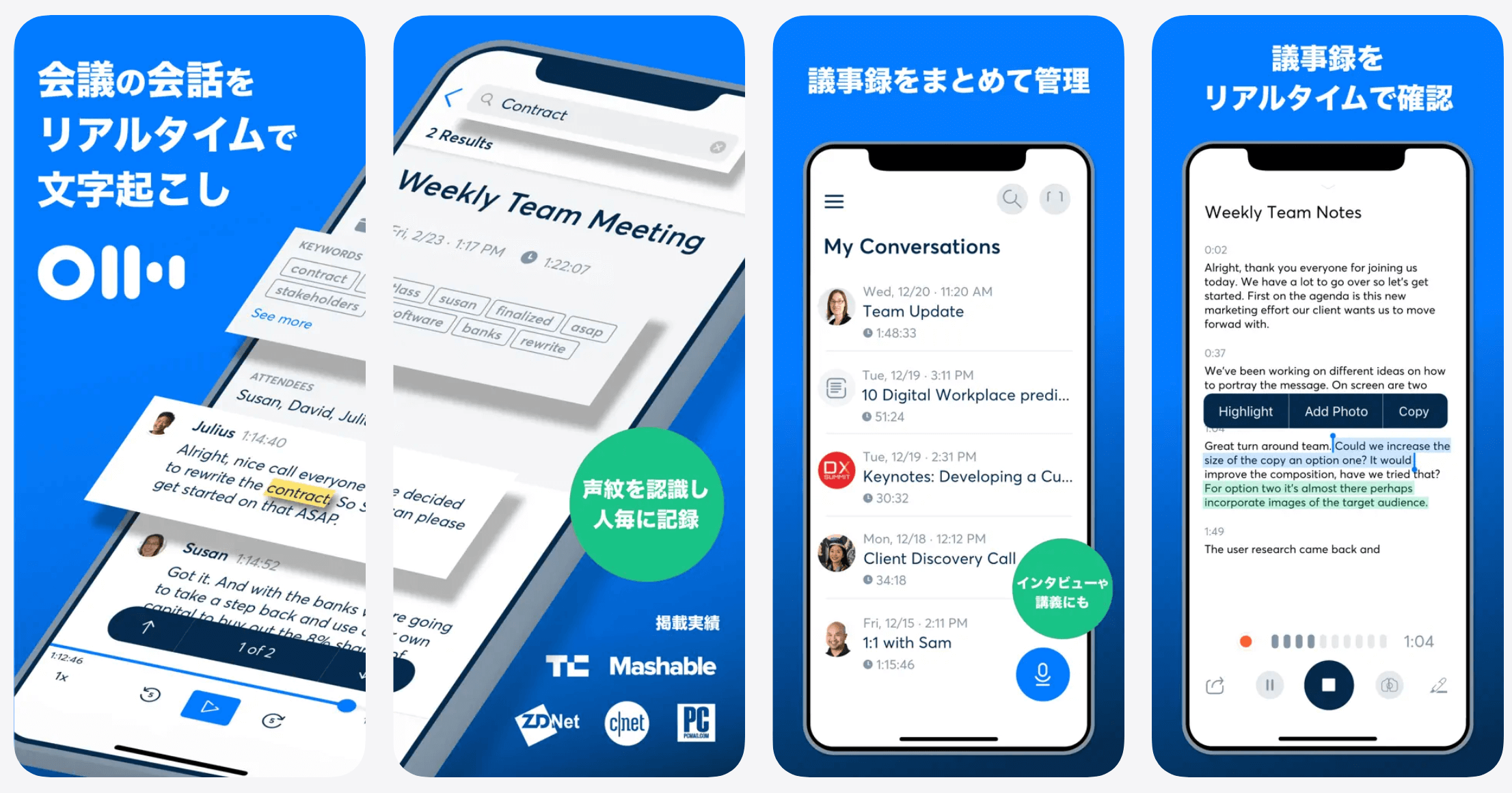 iOSおよびAndroid対応のアプリをインストールすれば、スマホひとつで録音から編集まで完結できます。App StoreまたはGoogle Playストアで「Otter」と検索してダウンロードしてください。