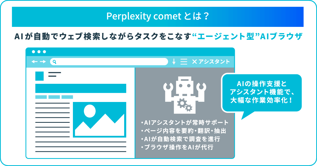 Comet は、AI検索ツール「Perplexity」が開発した独自のAI搭載Webブラウザです。思考のスピードでブラウジングを実現することをコンセプトとし、AIエージェント機能や複数タブをまたいだタスク実行など高度な性能を備えています。