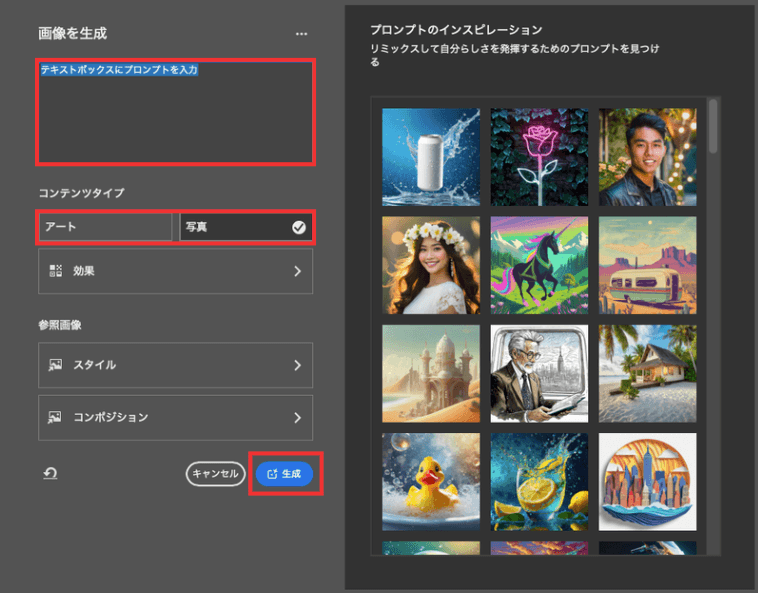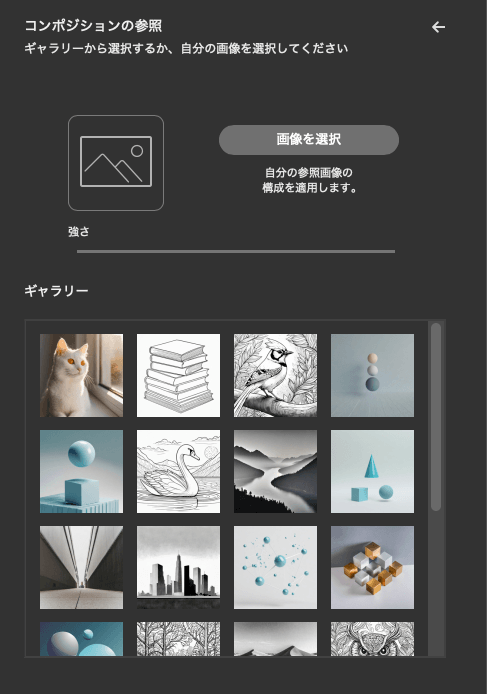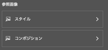 「画像を生成」パネルのスタイル設定では、参照画像として「スタイル」や「コンポジション」を指定できます。