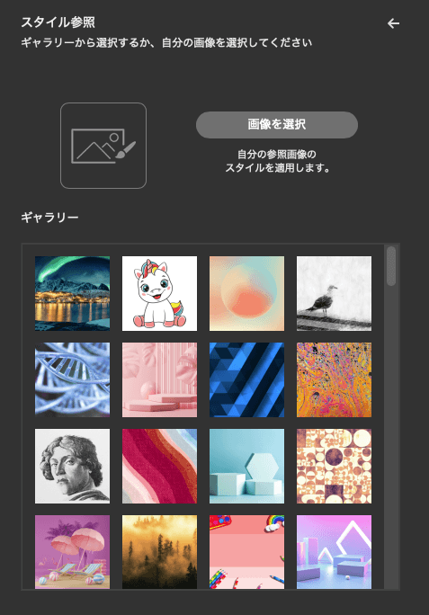 「スタイルの参照」で手持ちの画像をアップロードまたはギャラリーを参照させると、そのトーン・カラーパレット・タッチをAIが解析してプロンプトに反映します。