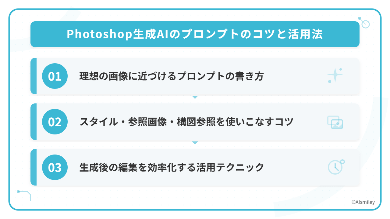ここでは、プロンプトの書き方や参照機能の活用法、生成後の効率的な編集テクニックを解説します。