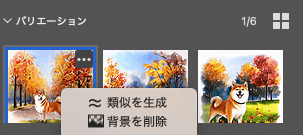 「類似を生成」は、生成済みの画像を元に似たバリエーションをさらに追加する機能です。