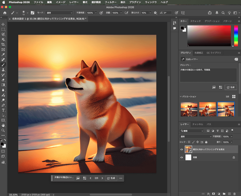 たとえば「夕焼けの海辺にいる柴犬」とテキストを入力するだけで、その通りの画像が生成されます。デザインのラフイメージを素早く形にしたいときや、フリー素材が見つからないときに重宝します。