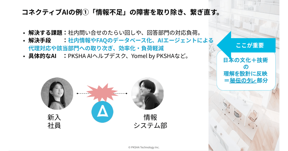 実際に現場で活用が進んでいるのは、コンタクトセンターにおけるオペレーターと顧客間や、社内ヘルプデスクにおける従業員とバックオフィス間、あるいは会議での参加者同士の間などです。上野山氏はこれらを「コネクティブAI」と定義し、具体的な事例を紹介しました。
