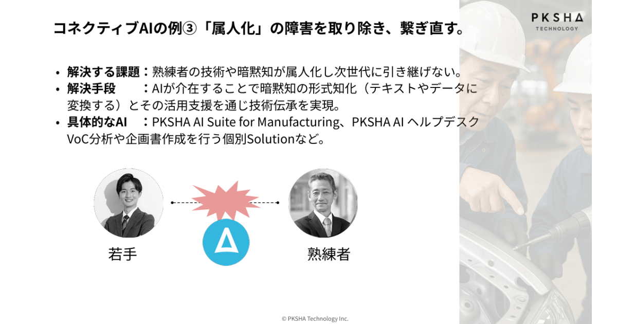 また、製造業では熟練技術者の退職に伴う技能継承が、深刻な問題となっています。こちらでもAIが熟練者と若手の間に介在し、熟練者のノウハウや暗黙知を学習して若手に繋いでいくという、新しい継承の形が生まれつつあります。