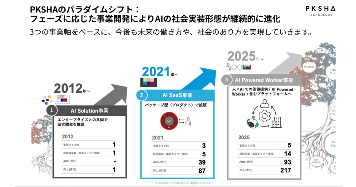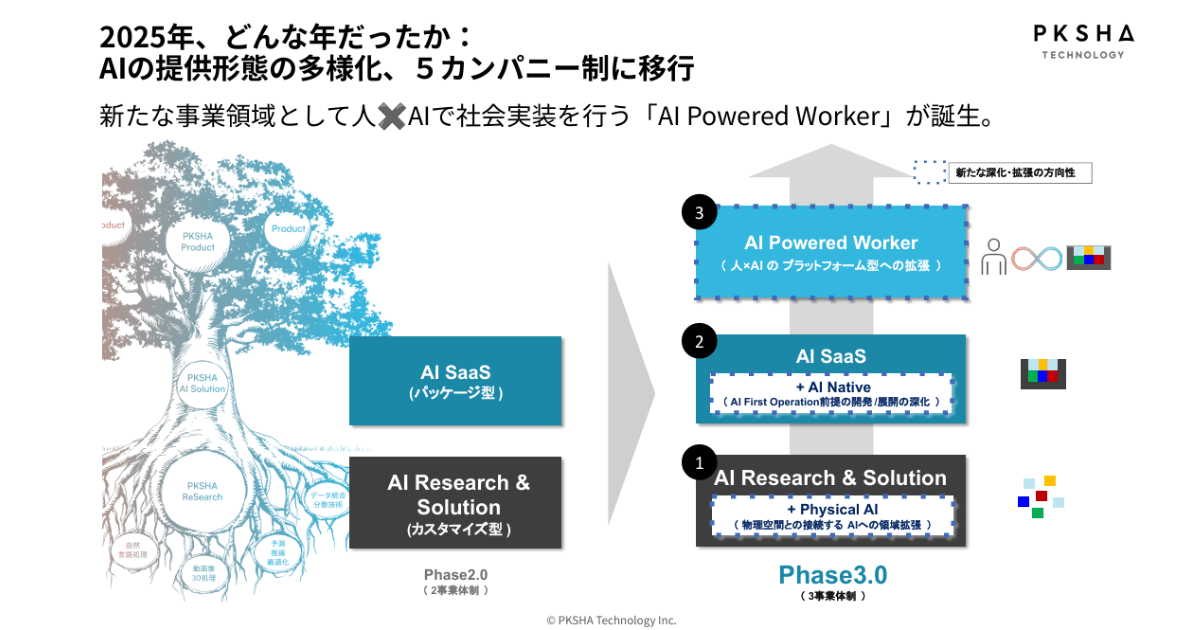 PKSHAは、今まで「AI SaaS」と「AI Research&Solution」の2事業体制で運営を行ってきました。2025年10月より、新たな事業領域として人×AIで社会実装を行う「AI Powered Worker」を発表。