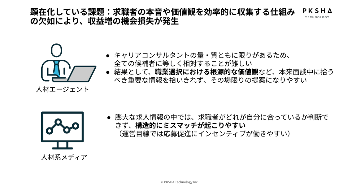 本来、求職者一人ひとりの価値観や過去の意思決定プロセスを深く理解するには、多大な時間が必要です。しかし、人材エージェントのコンサルタントは多忙を極めており、求職者一人ひとりに対して十分なカウンセリング時間を確保し、人生の深堀りを行うことは現実的に困難な状況にあります。