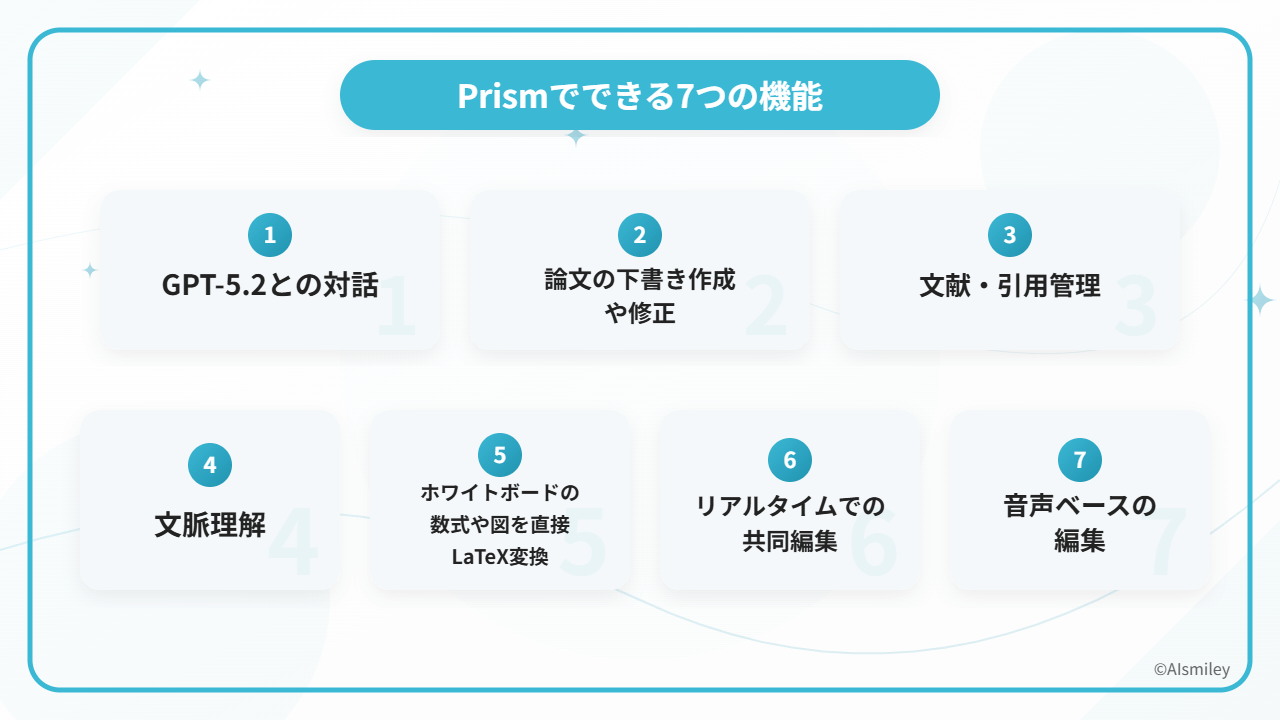 Prismは単なるLaTeXエディタではなく、AIを活用した多彩な機能を備えた総合的研究支援ツールです。
