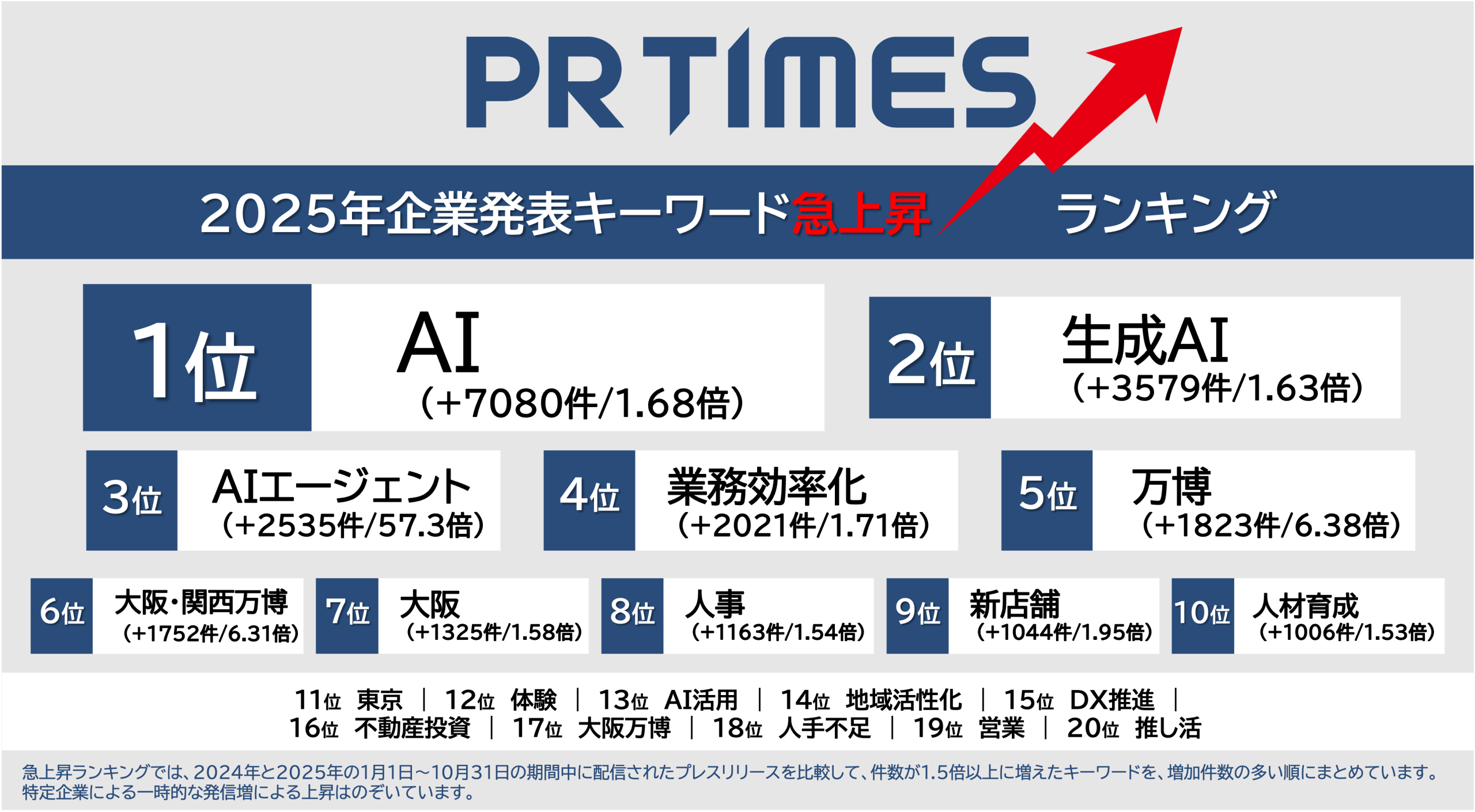 PR TIMESは、2025年に企業が発表したプレスリリースを対象に、データ分析や総括、業界別の傾向、各種ランキングを公開しました。急上昇ランキングでは「AI」が1位となり、「AI」関連キーワードも大きな注目を集めています。