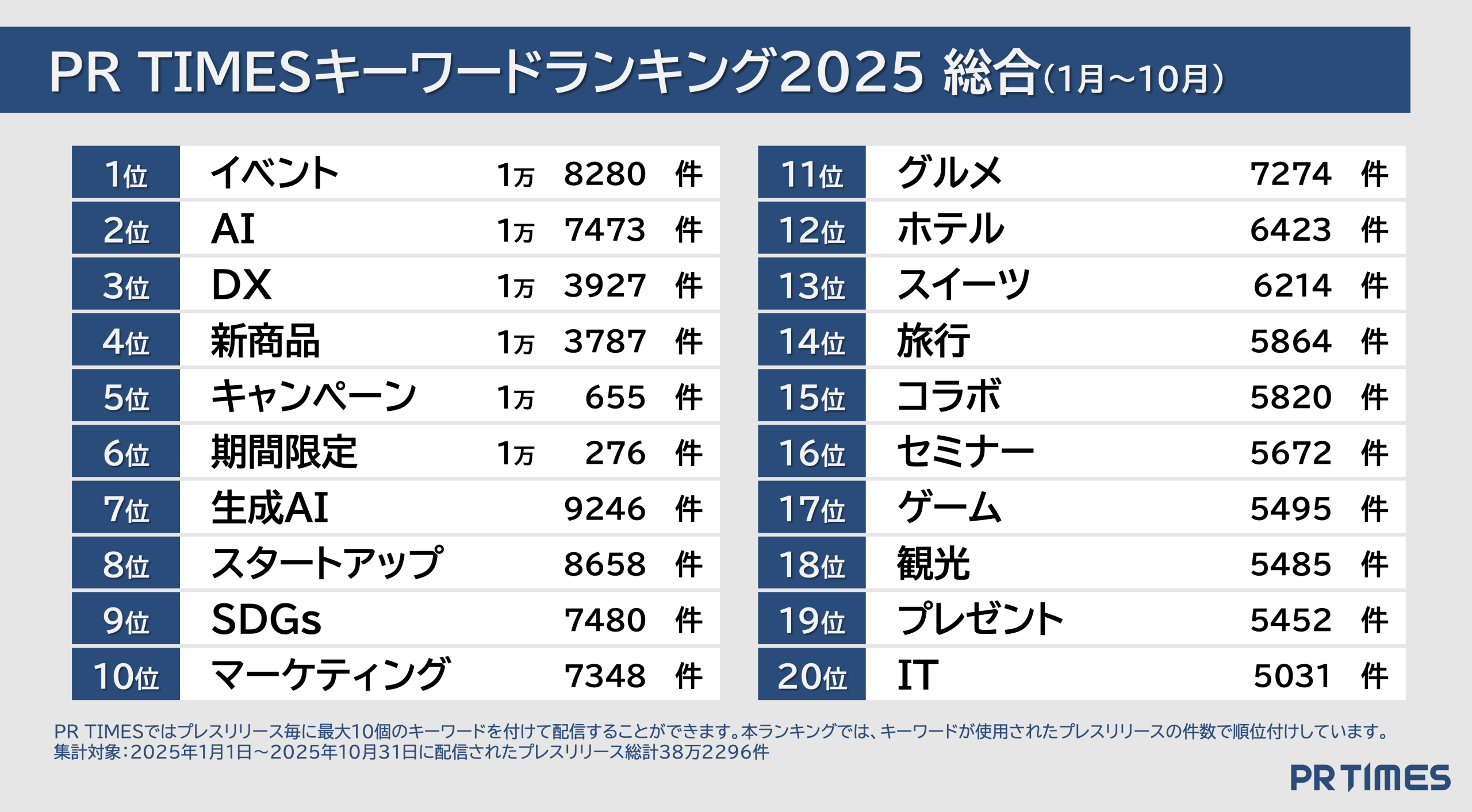 株式会社PR TIMESは、2025年11月28日、自社のプレスリリース配信サービス「PR TIMES」において、2025年1月1日〜10月31日の間に企業発表が行われたプレスリリース計38万2296件を対象に、データ分析や総括、業界分析、各種ランキングの発表を行いました。