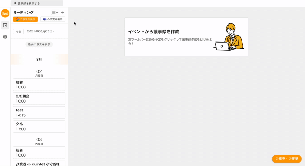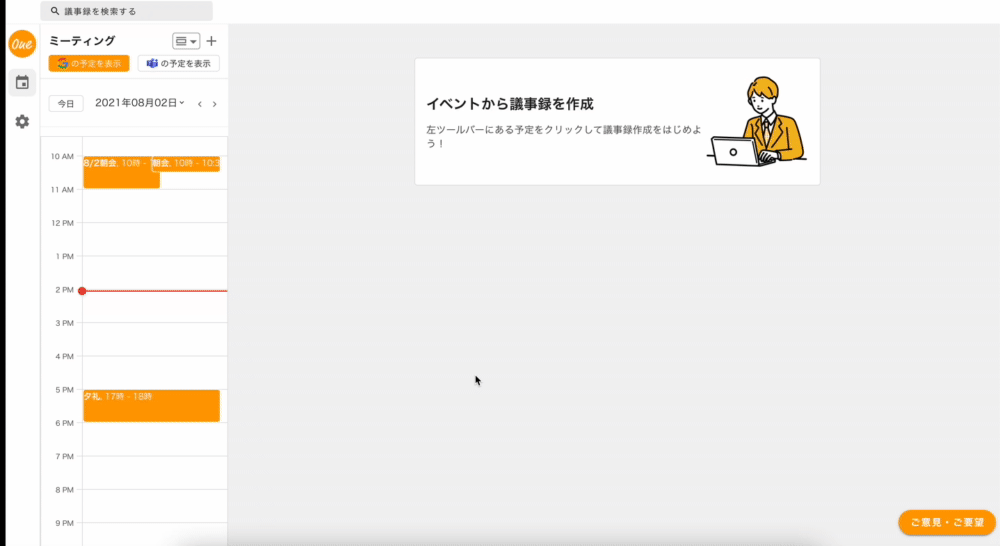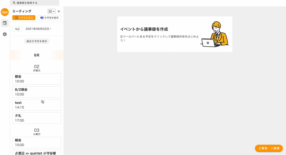 任意の予定をクリックするとその予定に紐付いた議事録を作成することが可能です。