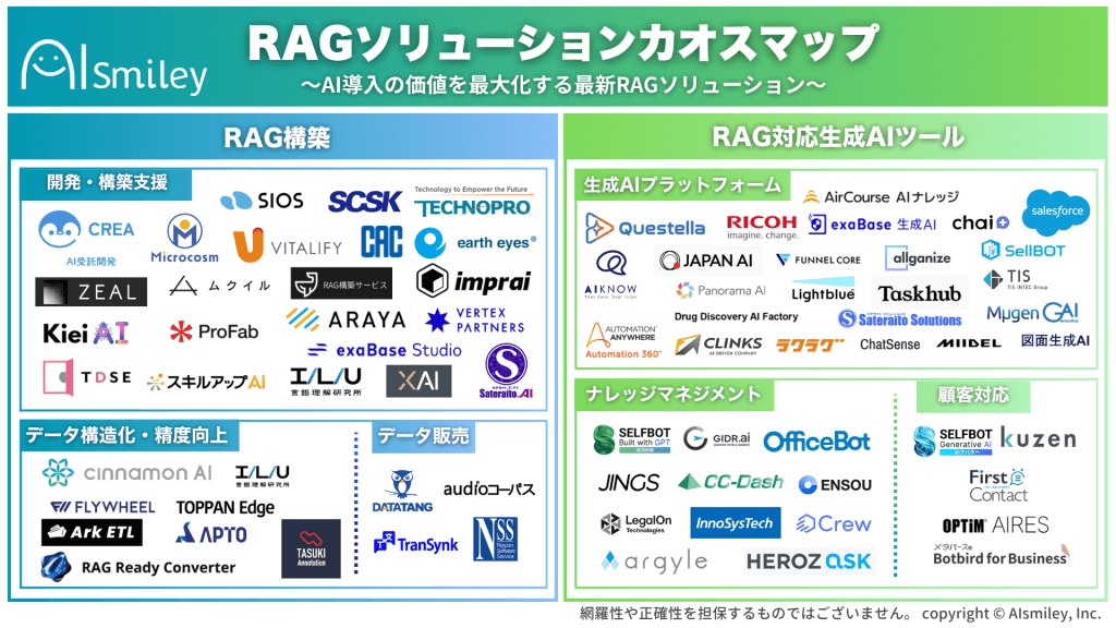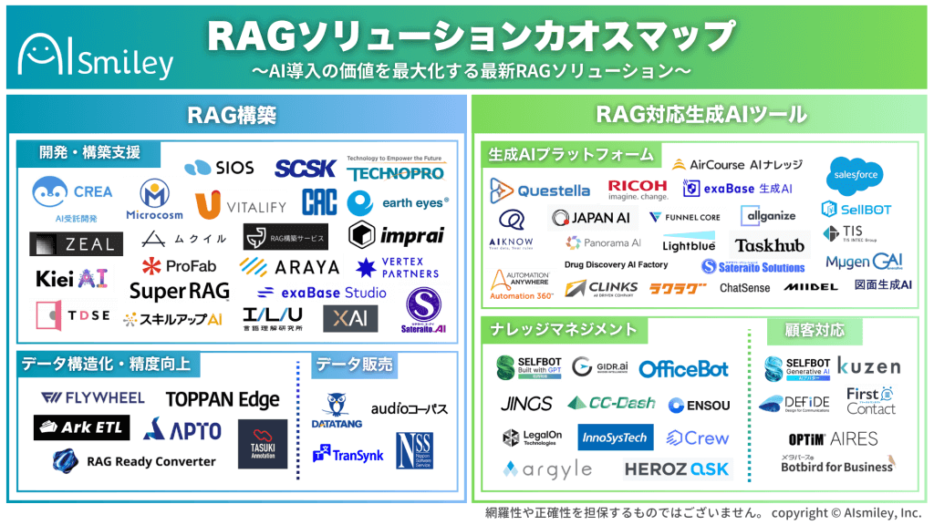 AIポータルメディア「AIsmiley」を運営する株式会社アイスマイリーは、幅広い業界において活用できる最新のRAGソリューションサービスをまとめた「RAGソリューションカオスマップ」を、2025年10月8日に公開しました。掲載総数は84製品です。