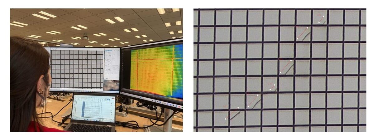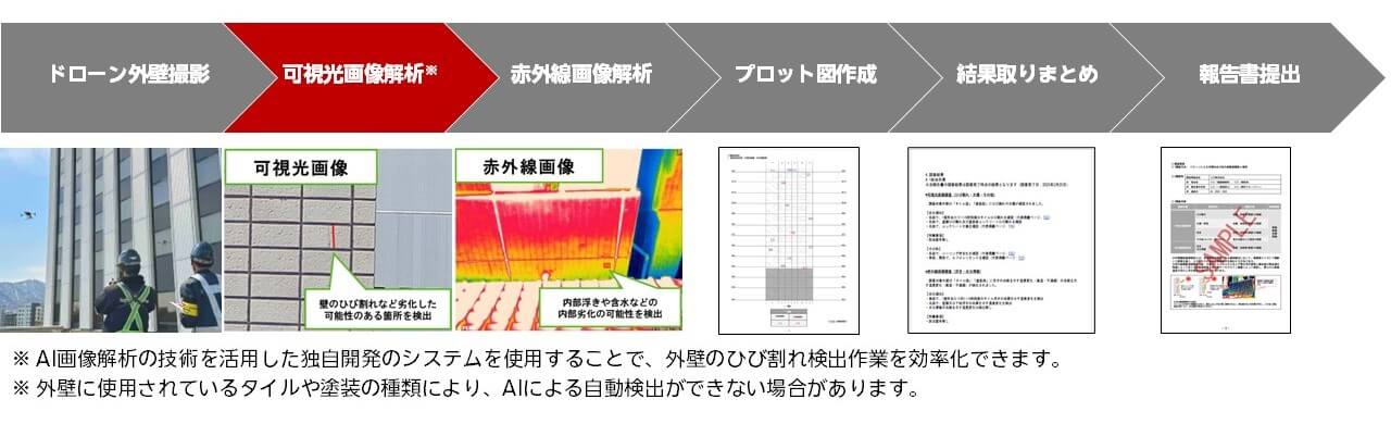「AI外壁調査」は、撮影した可視光画像からひび割れの疑いがある箇所をAIによる画像解析で自動検出し、専門スタッフによる目視確認を組み合わせることで、信頼性を確保しています。さらに専門スタッフは、赤外線画像を基に温度差などの情報から内部浮きや含水などの内部劣化の可能性を解析します。