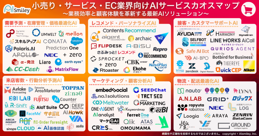 AIポータルメディア「AIsmiley」を運営する株式会社アイスマイリーは、業務効率と顧客体験を革新する最新AIソリューションをまとめた「小売り・サービス・EC業界向けAIサービスカオスマップ」を、2025年11月17日(月)に公開しました。掲載総数は90製品以上です。