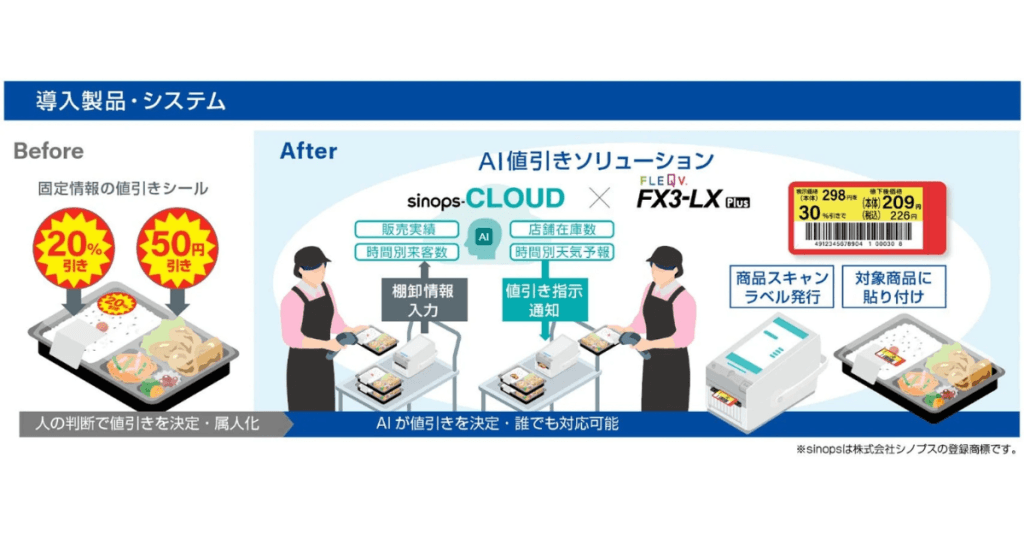 今回導入した「AI値引きソリューション」は、サトーの次世代IoT搭載ラベルプリンター「FLEQV®(フレキューブ®)FX3-LX」に、シノプスのAI値引算出サービス「sinops-CLOUD AI値引」を連携させたソリューションです。