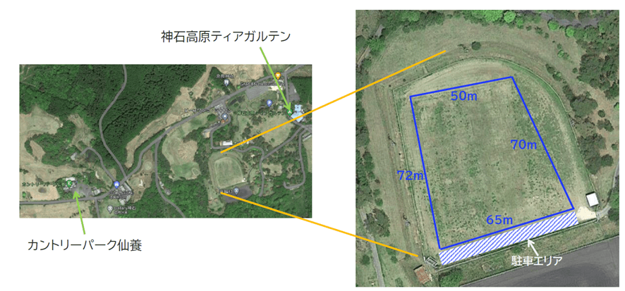 2024年3月には、神石高原ティアガルテンの芝グラウンドで実験を実施しました。NECソリューションイノベータ社が開発したAIプログラムを搭載したドローンを使用し、上空50m(真下・カメラ角度90°)や上空20m(斜め・カメラ角度60°)など、さまざまな高度・角度で検知性能を確認しました。実験では、「歩行者を検知できるか」「着陸時に人を検知して停止し、人が離れたら再開して着陸できるか」など複数のシナリオを設定し、いずれも良好な結果を得ることができました。