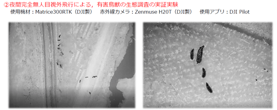 赤外線カメラで夜間の動きを確認したり、群れの行動パターンを把握したりすることで、農家の方々の被害軽減に役立てています。生態調査ではイノシシの個体数を把握することはできますが、実際の駆除となると簡単ではありません。イノシシは夜に巣穴をつくり、朝5時から午前10時ごろまではその巣穴で眠っています。そのため、私たちはイノシシが寝ている時間帯にドローンを飛ばし、超音波を照射して驚かせ、逃げ出したところを猟友会の方々の協力を得て駆除しています。猟友会の皆さんの長年の経験と、ドローンのテクノロジーを掛け合わせた“ハイブリッドな駆除” を目指して実験を重ねています。