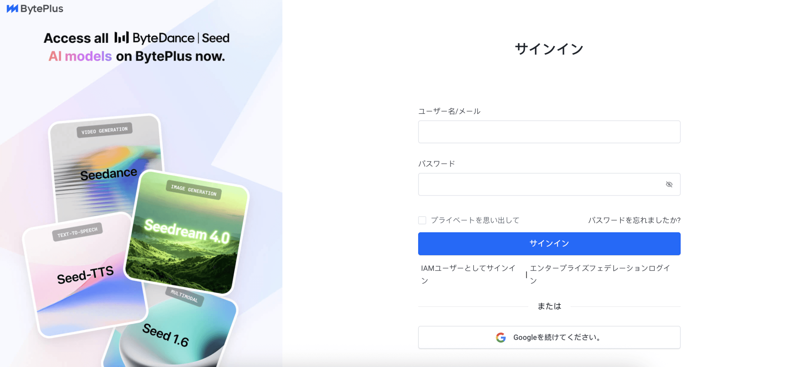 BytePlusの公式サイトにアクセスし、TikTokアカウントまたはメールアドレスでアカウントを作成・ログインします。