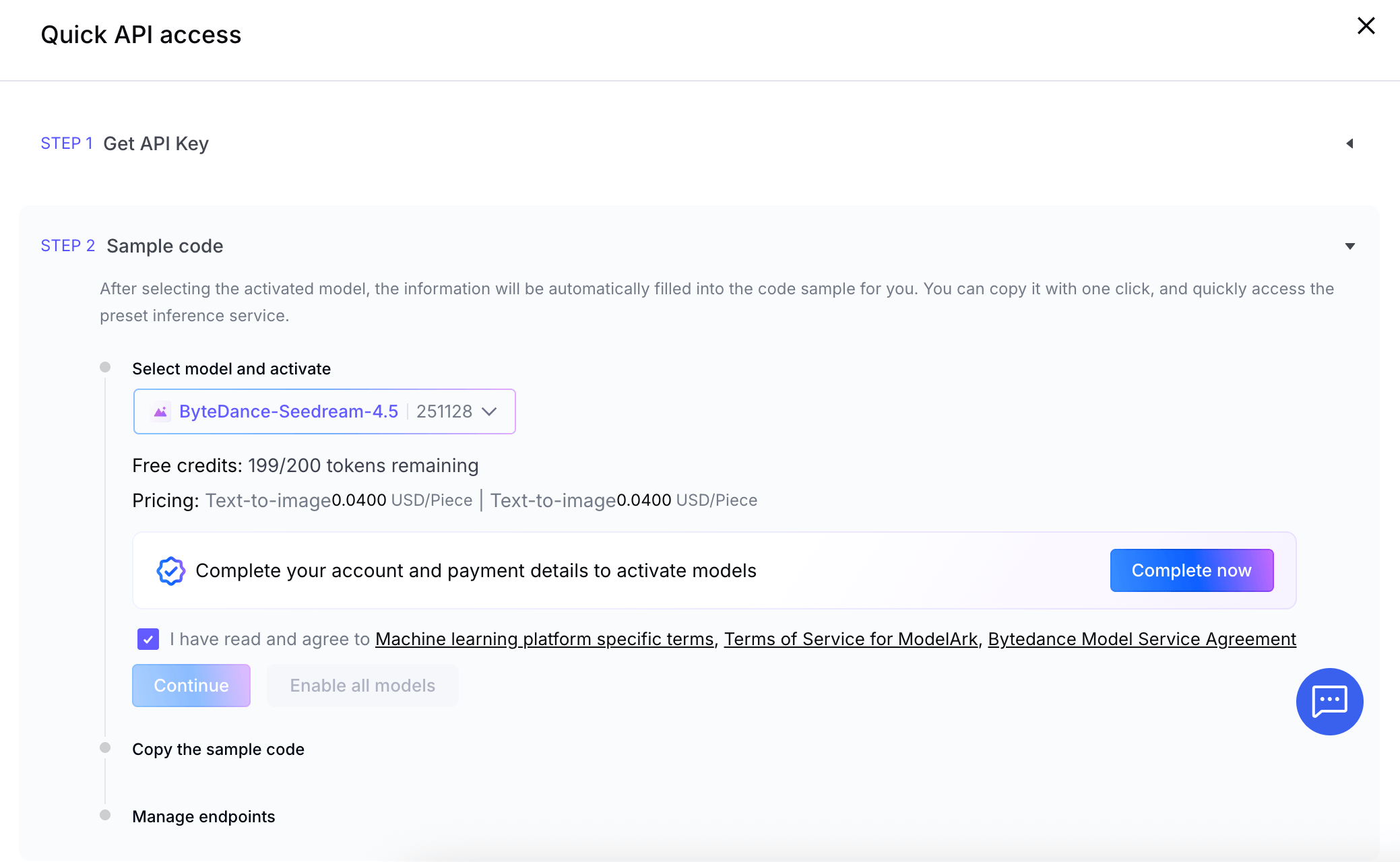 BytePlus ModelArkに新規登録すると、200枚分の無料生成枠が付与されます(2026年2月時点。内容は予告なく変更される場合があります)。