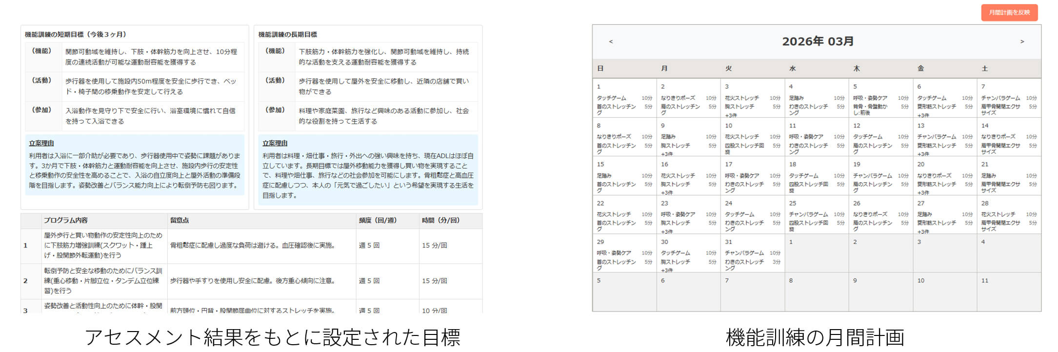 介護施設では、利用者の自立した生活の支援や身体機能の維持・向上を目的に、日々機能訓練が実施されています。一方で、利用者一人ひとりに合わせた訓練を行うためには、個々の状況確認から計画策定、訓練の実施、記録、書類作成まで多岐にわたる業務が発生し、スタッフの大きな負担となっています。