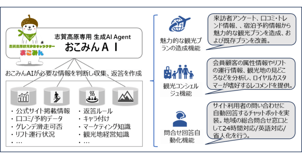 長野経済研究所は、地域内の総合窓口として活躍できる、志賀高原専用生成AIエージェント「おこみんAI」β版をリリースしました。観光コンシェル機能による売上増加や問い合わせ自動対応によるコスト削減など、より競争力の高い稼げる観光地を目指します。